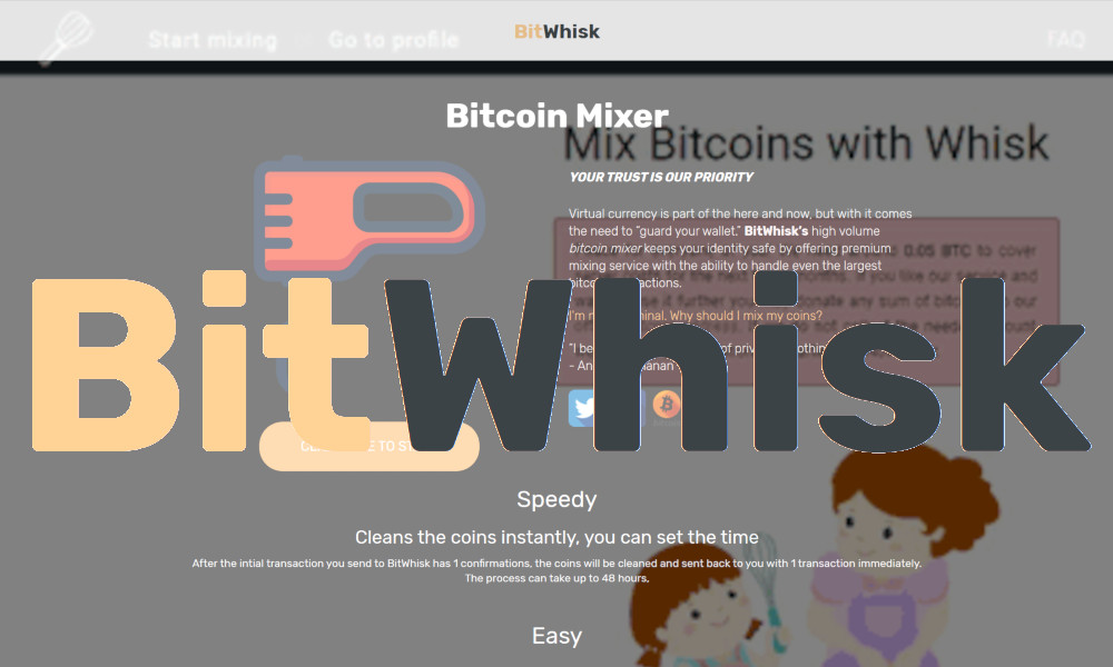 "Virtual currency is part of the here and now, but with it comes the need to “guard your wallet.” BitWhisk’s high volume bitcoin mixer keeps your identity safe by offering premium mixing service with the ability to handle even the largest bitcoin transactions." "Cleans the coins instantly, you can set the time. After the intial transaction you send to BitWhisk has 1 confirmations, the coins will be cleaned and sent back to you with 1 transaction immediately. The process can take up to 48 hours."