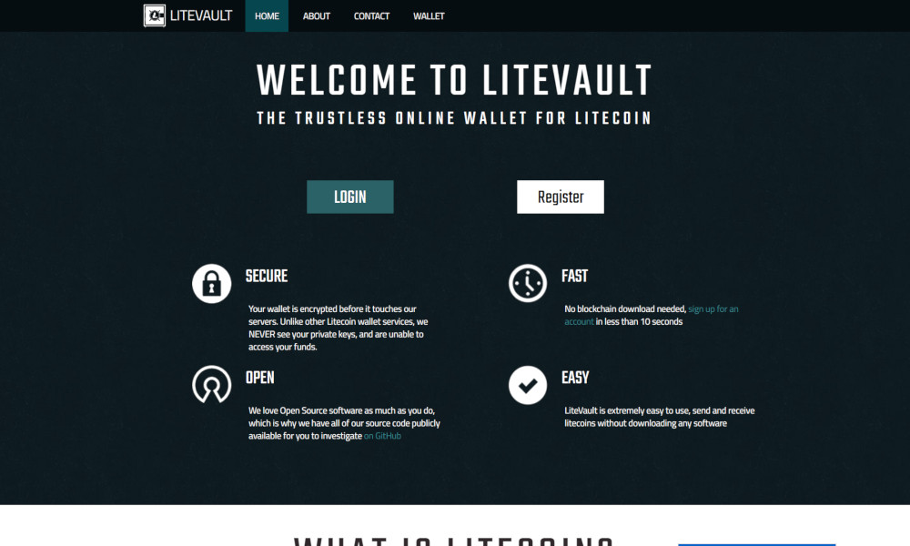 "Welcome to LiteVault - The trustless online wallet for litecoin." "Your wallet is encrypted before it touches our servers. Unlike other Litecoin wallet services, we NEVER see your private keys, and are unable to access your funds."