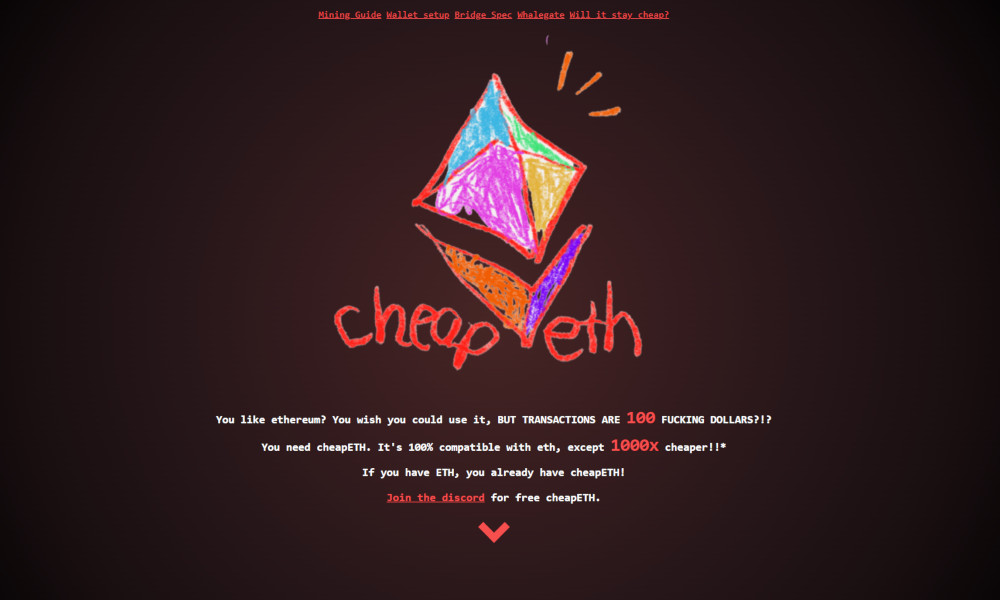 "cheapETH is a fork of the main Ethereum chain at block 11818959. Think Bitcoin Cash, but for Ethereum instead of Bitcoin. The money is cheap, the transactions are fast, and the party is still going." "Think about it. A transaction that costs $77 on ETH, is only $0.08 on cheapETH. Made possible by cheapgas. The cheap eth gang solves the gas crisis."