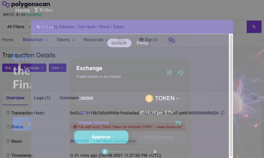 Millions of users received airdropped tokens directly into their wallet. When attempting to transfer them, they are instructed that they need to first claim them on the DxDex website. Copying the website text and linking to a CoinTelegraph article about ExoniumDex, the DxDex appears to offer a promising new technology and establishes credibility with users, who are prompted to connect their wallet to "Unlock" the tokens. In reality, the transaction they are approving is one which grants the scammers full access to withdraw the remaining tokens from their wallet. It is reported by Coinbase that over $15m was taken through these and similar scams, and the tactics and domain used are constantly evolving.