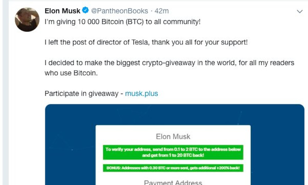 "A widespread scam pretending to be from Elon Musk and utilizing a stream of hacked Twitter accounts and fake giveaway sites is being pulled off by attackers hacking into verified Twitter accounts and then changing the profile name to "Elon Musk". They then tweet out that he, being Elon, is creating the biggest crypto-giveaway of 10,000 bitcoins."