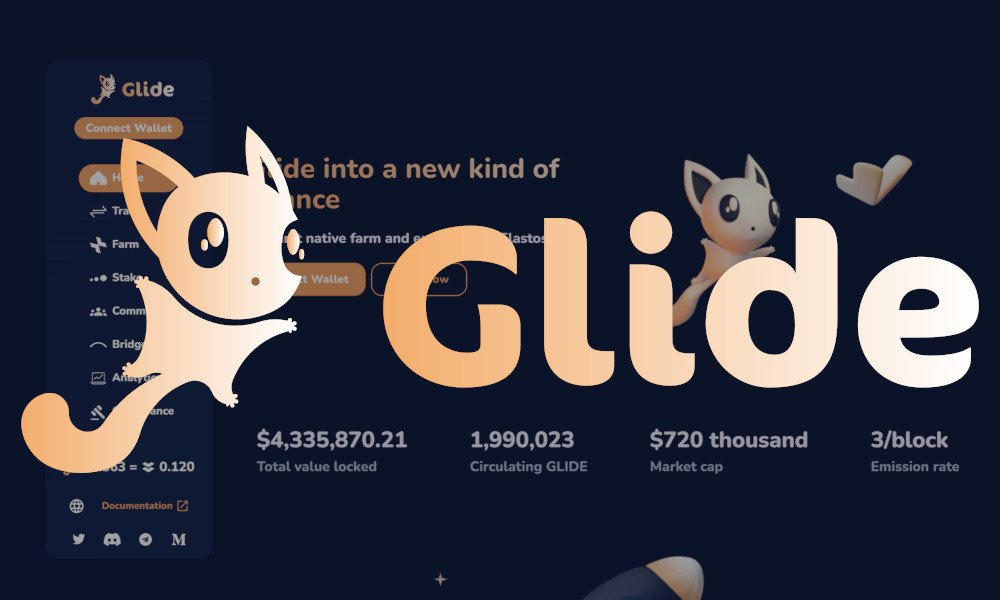 "Glide into a new kind of finance. The first native farm and exchange on Elastos." "Glide Finance is a Decentralized Exchange / Automated Market Maker, Yield Farming, and Staking platform running on the Elastos Smart Chain (ESC) that aims to accelerate adoption of the Elastos ecosystem by acting as a source of liquidity for users and the projects built on it. We're invested in building a strong foundation with our GLIDE token as a governance token, diverse farms, a built in bridge, and more features down the line."