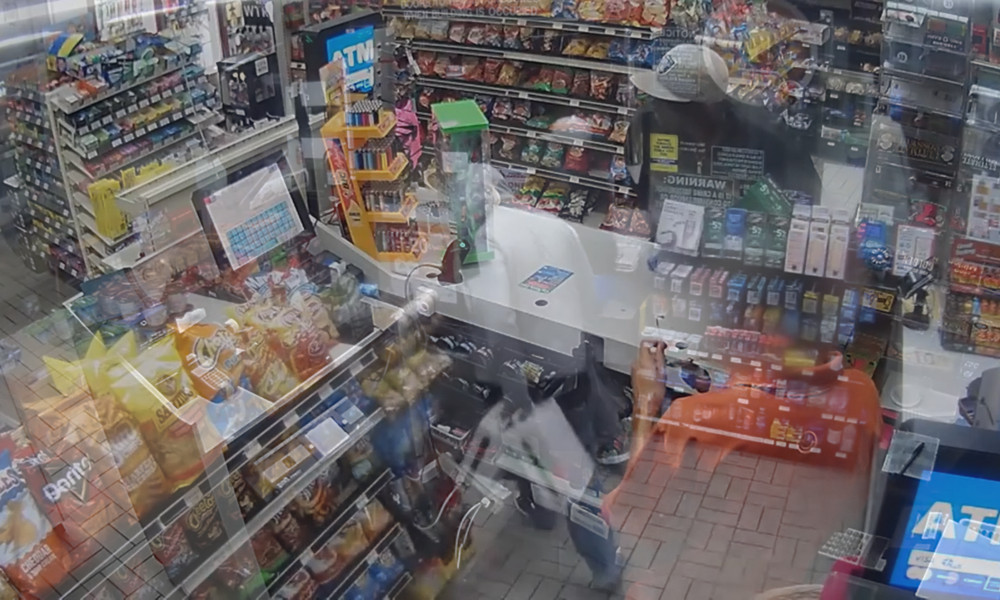 "Surveillance footage shows a man in a hoodie walk in and spray the clerk with bear deterrent — a type of pepper spray stronger than what's sold for self-defense against humans." "A second man follows and hands a crowbar to the first robber, who pries open the ATM. The accomplice stands guard near the register while the clerk wipes his eyes."