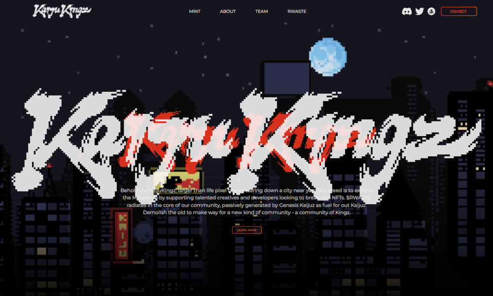 "Kaiju Kingz is a collection of 3,333 Genesis pixel beasts created by Augminted Labs sent to protect the Metaverse that live on the Ethereum blockchain." "Behold the KaijuKingz; larger than life pixel beasts tearing down a city near you. Our creed is to expand the Metaverse by supporting talented creatives and developers looking to break into NFTs. $RWASTE radiates in the core of our community, passively generated by Genesis Kaijuz as fuel for out Kaijuz. Demolish the old to make way for a new kind of community - a community of Kingz."